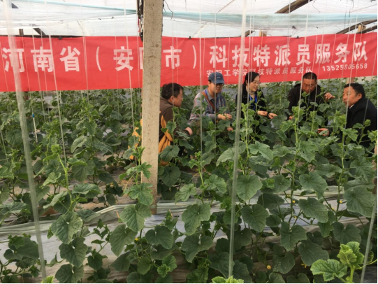 3月下旬,安阳市气温回暖,温室大棚薄皮甜瓜进入到开花结果期,吴秋芳一行来到鑫鑫蔬菜种植专业合作社基地,仔细查看温室里的刚刚引进的薄皮甜瓜博洋系列新品种的长势、肥水管理、病虫害防治等情况。科技特派员建议从甜瓜开花到甜瓜膨大期,棚内少施或不施氮肥,控制土壤含水量。在甜瓜幼果开始膨大时,追施磷肥和钾肥为主,结合灌水同时进行。加强甜瓜霜霉病、白粉病、炭蛆病、白粉虱、蚜虫等病虫害的防治,在甜瓜进入到结果期后,昼夜温差大有利于甜瓜糖分的积累,提高甜瓜的品质。