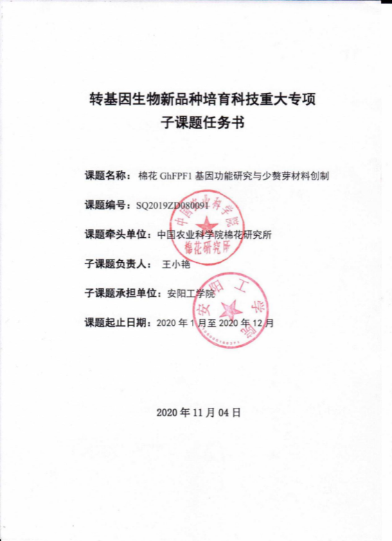 5.转基因生物新品种培育科技重大专项子课题:棉花GhFPF1基因功能研究与少赘芽材料创制