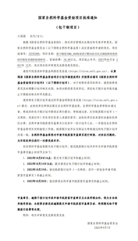 3.国家自然科学基金资助项目:基于棉花TEM2_A03转录因子靶向结合位点海陆种间变异的纤维发育调控机理研究