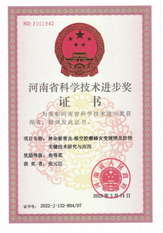 6.河南省科学技术进步奖三等奖:林业新害虫-栎空腔瘿蜂灾变规律及防控关键技术研究与应用