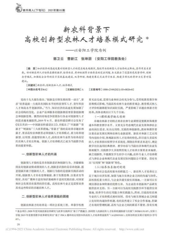 9.新农科背景下高校创新型农林人才培养模式研究——以beat365唯一官方网站为例,教书育人(高教论坛)