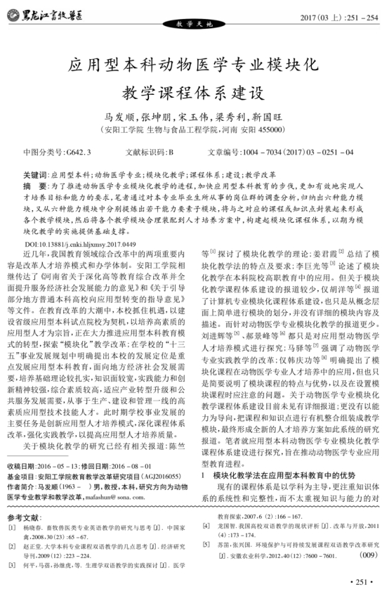 应用型本科动物医学专业模块化教学课程体系建设 |